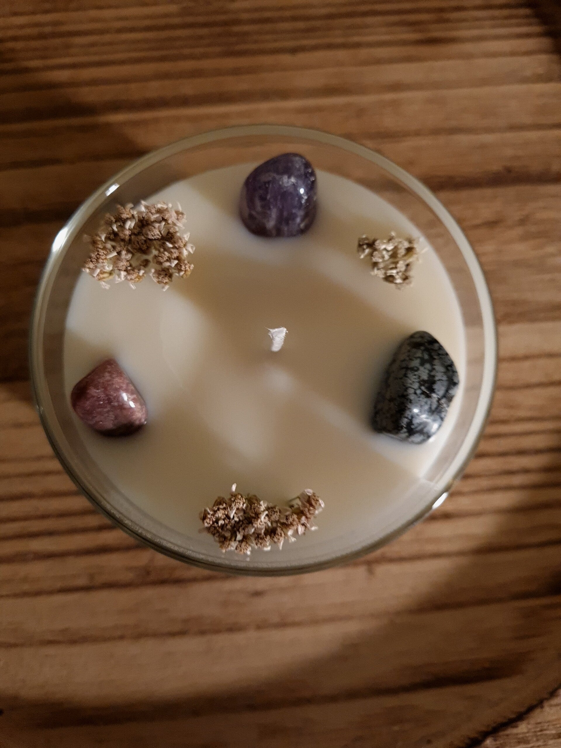 - Achten Sie auf eine sichere Position der Edelsteine. Die Steine dürfen den Docht nicht berühren oder zu nah an der Flamme liegen. Platzieren Sie die Edelsteine sicher in der Wachsschicht.